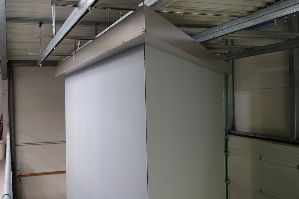 Ausfahrbare Rauchschürzen, die verdeckt montiert werden und erst im Brandfall in ihre Bestimmungsposition fahren, erfordern normalerweise seitliche Führungsschienen, um die konstruktionsbedingten Leckageflächen auf ein Minimum zu reduzieren. Da die Anordnung von Pfeilern mit integrierten Führungsschienen nicht an allen Stellen möglich war, musste eine Lösung gefunden werden, den Spalt von zwei aneinanderstoßenden Rauchschürzen so gering wie möglich auszubilden. Dies gelang in enger Zusammenarbeit mit dem Hersteller durch eine Optimierung der Rauchschürzenkästen, um die Rauchschürzentücher nahe genug aneinanderführen zu können (Bild 2). Darüber hinaus wurde mit einem für diesen Einsatzzweck neu entwickelten Scharnier eine Verbindung benachbarter Ballastschienen ermöglicht. Dieses Scharnier lässt eine geringe Bewegung der beiden verbundenen Rauchschürzen in vertikaler und horizontaler Richtung zu, um mögliche Asynchronitäten beim Ausfahren auszugleichen Es verhindert aber gleichzeitig, dass die benachbarten Rauchschürzen auseinanderpendeln können.
